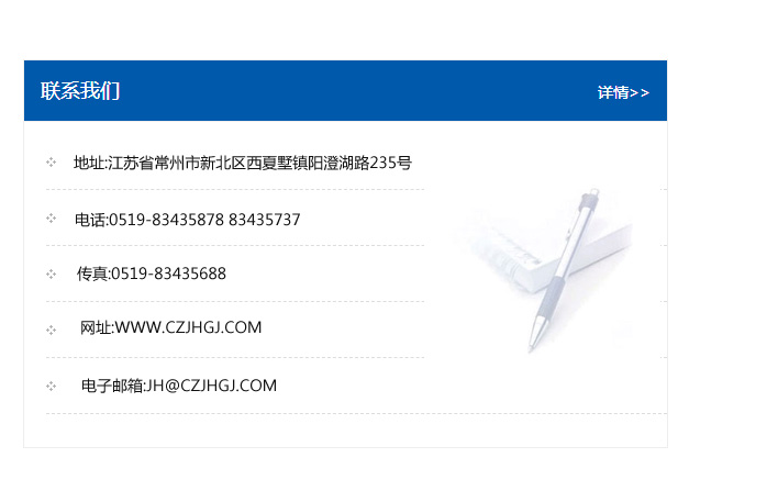 地址:常州市新北區友邦商務大廈1幢16、17層  電話:0519-85101652  傳真:0519-85112595  郵編:213022  網址:www_cz-jiayue_cn.mlp1.com  郵箱:xiajifengaa@163.com